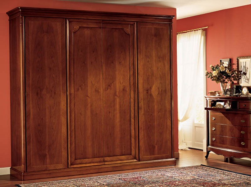 Armario clásico de nogal con 4 puertas para el dormitorio. Hecho completamente de nido de abeja. Tallas y embutidos están hechos completamente a mano. Cera de acabado. Armario también disponible con 2 puertas de espejo y detalles en pan de oro o plata.