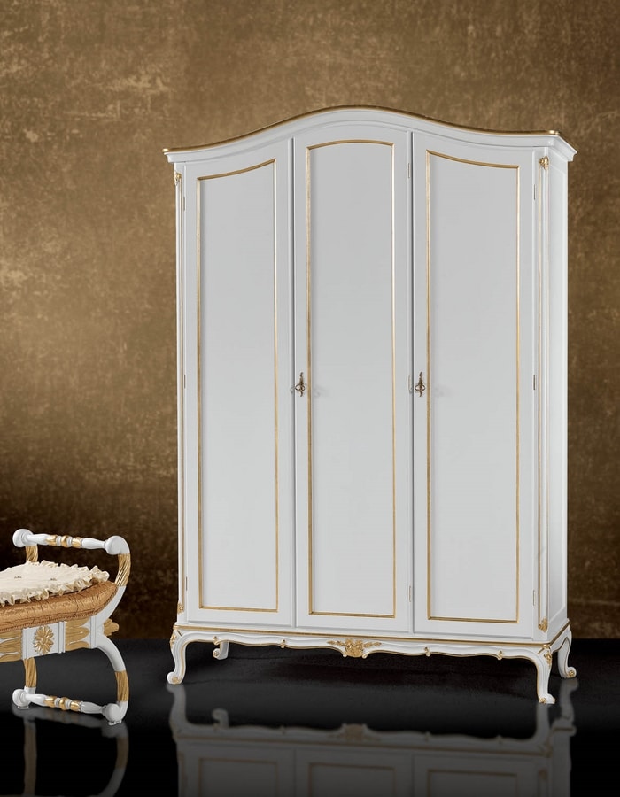 Armario lacado de 3 puertas con cajonera interior. Perchas y estantes de madera.