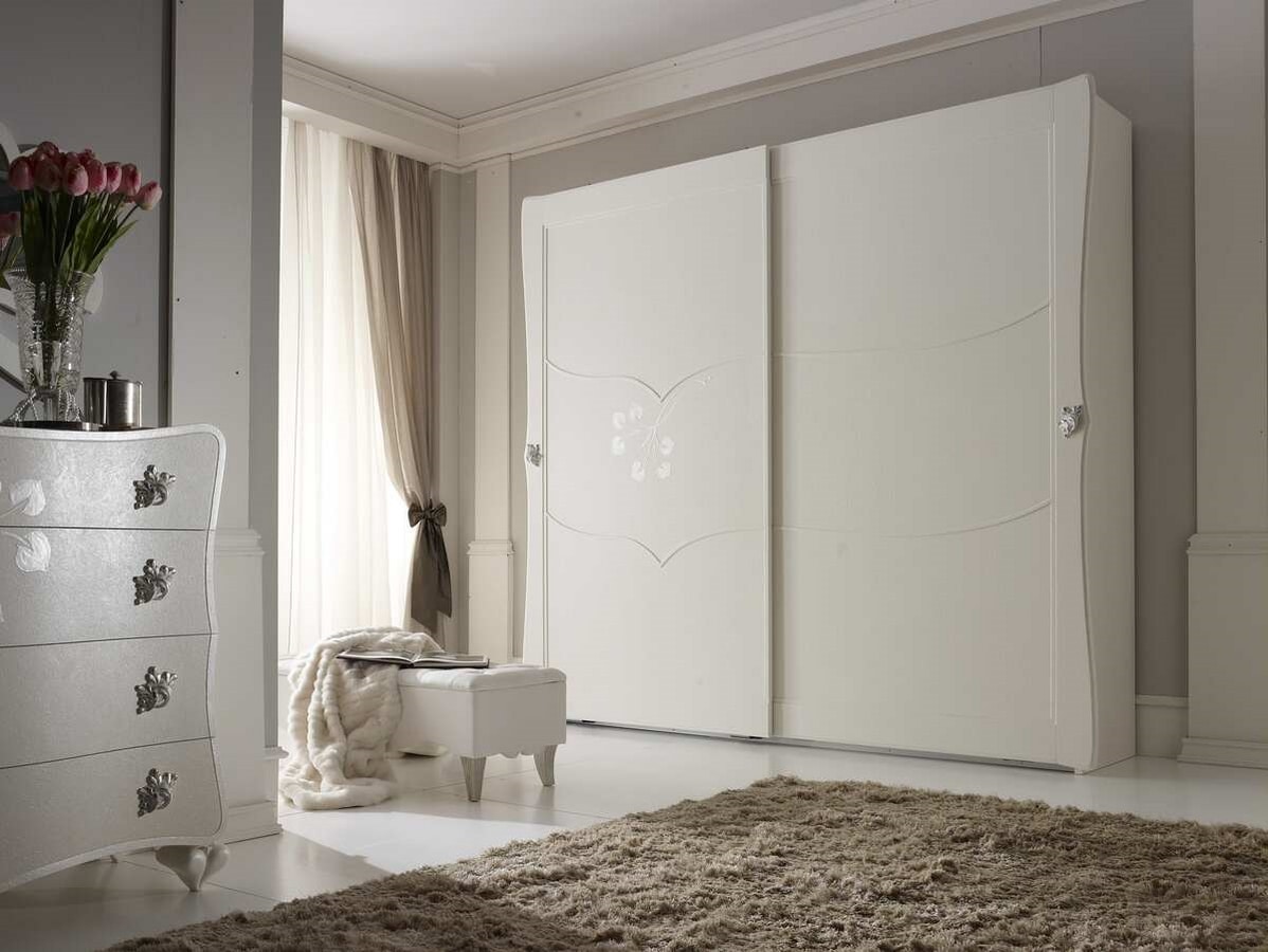 Armario con dos puertas correderas, estructura de madera lacada blanca. Manijas de plata.