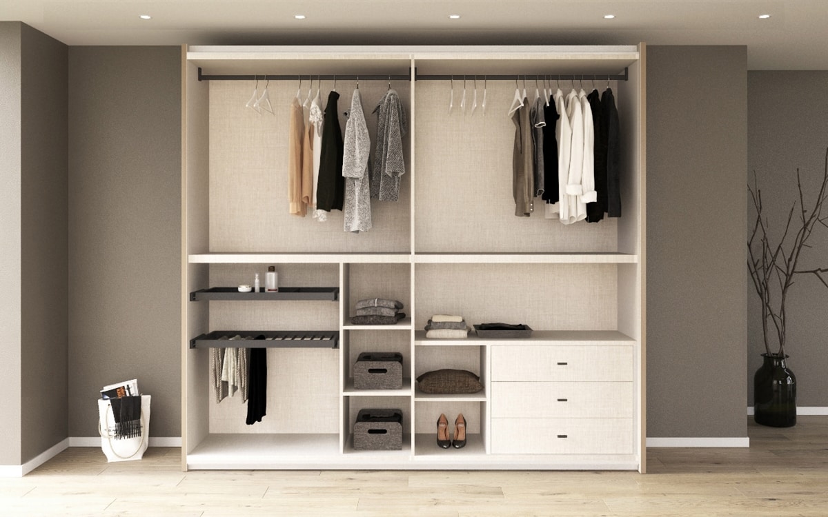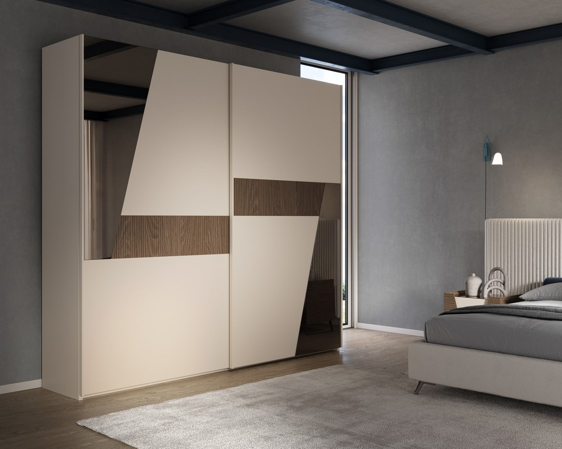 El armario refleja el diseño y la artesanía de las unidades que lo acompañan, con paneles de madera intrincadamente trabajados en las puertas, manteniendo la estética cohesiva de la colección.