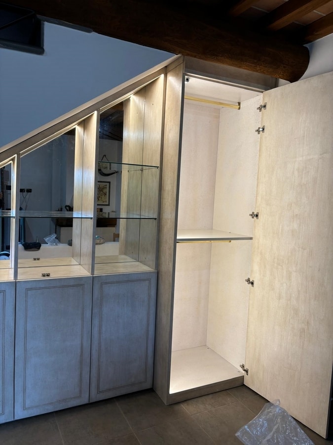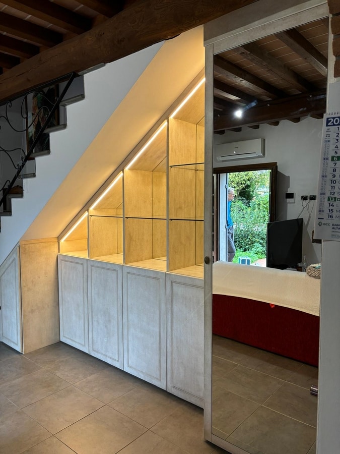 Solicitar precios Productos similaresArmario bajo escalera de estilo clásico, fabricado a medida. Equipado con espejo, estantes de cristal e iluminación LED.