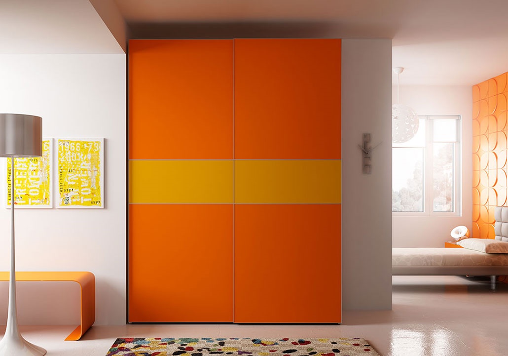 Armario con 2 puertas correderas, con rayas de colores con decoraciones metálicas.
