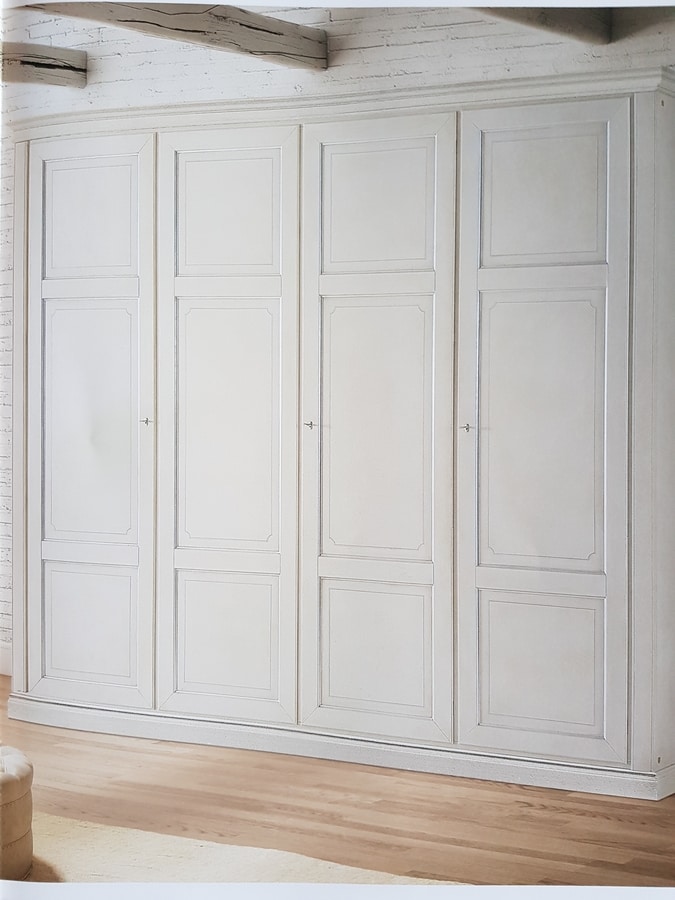 Armario con 4 puertas batientes lacadas con perfiles de plata y personal decorado, interior de madera natural con cajones, estantes y perchas. oscuro.