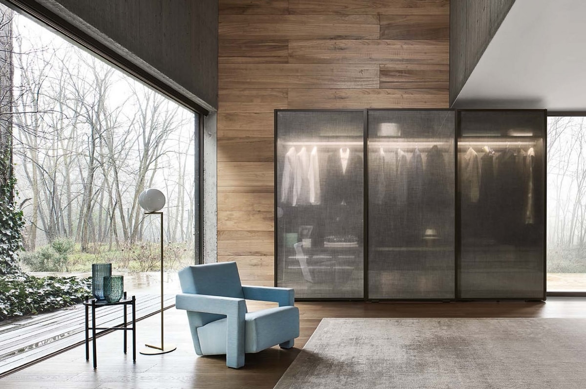 La puerta corredera Scrigno, con marco en metal marrón y vidrio transparente ahumado, transforma el armario en una pantalla fascinante, también gracias al sistema de iluminación interna. Las unidades de suéter, los cajones y las bandejas extraíbles en acabado Elm Dark con paneles frontales en vidrio muestran los accesorios y objetos más preciados.