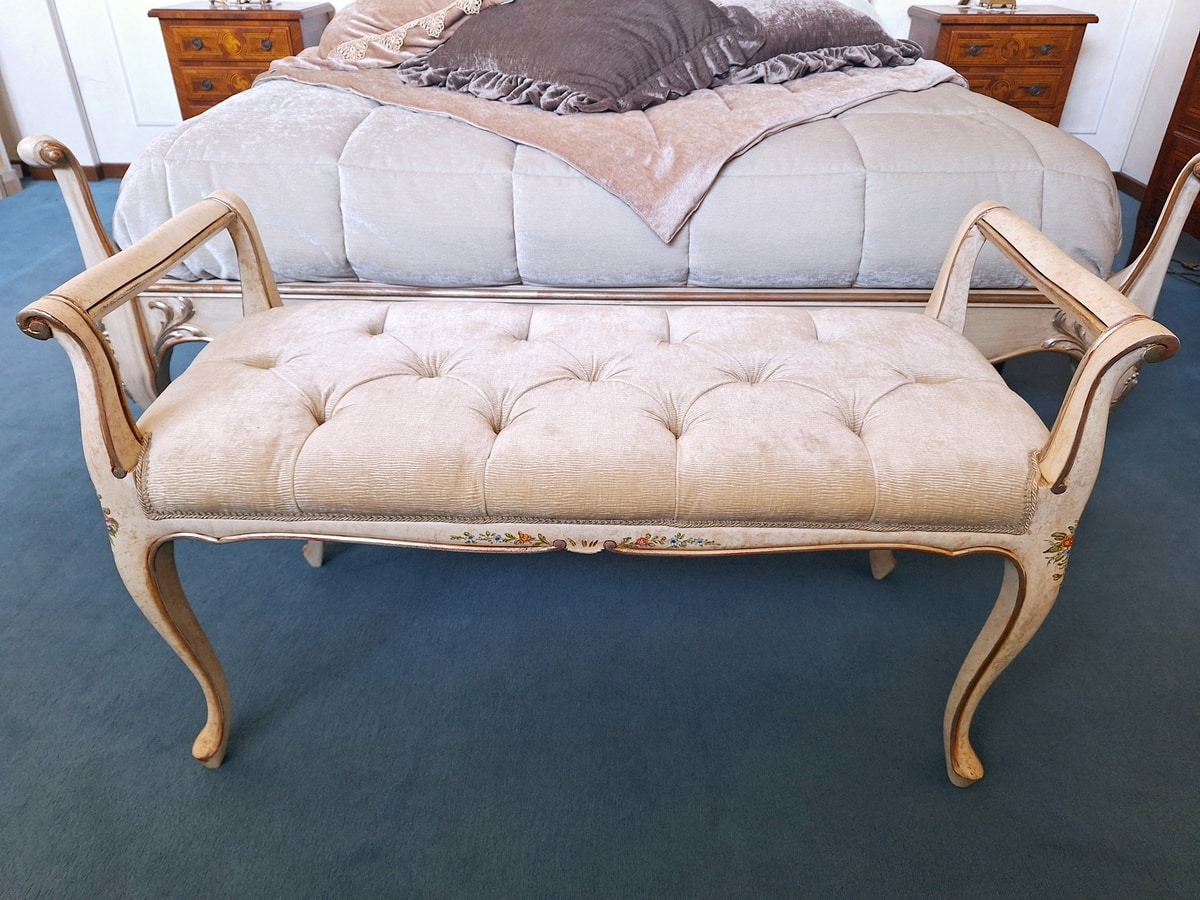 Banco lacado con crema, con decoraciones florales hechas a mano.