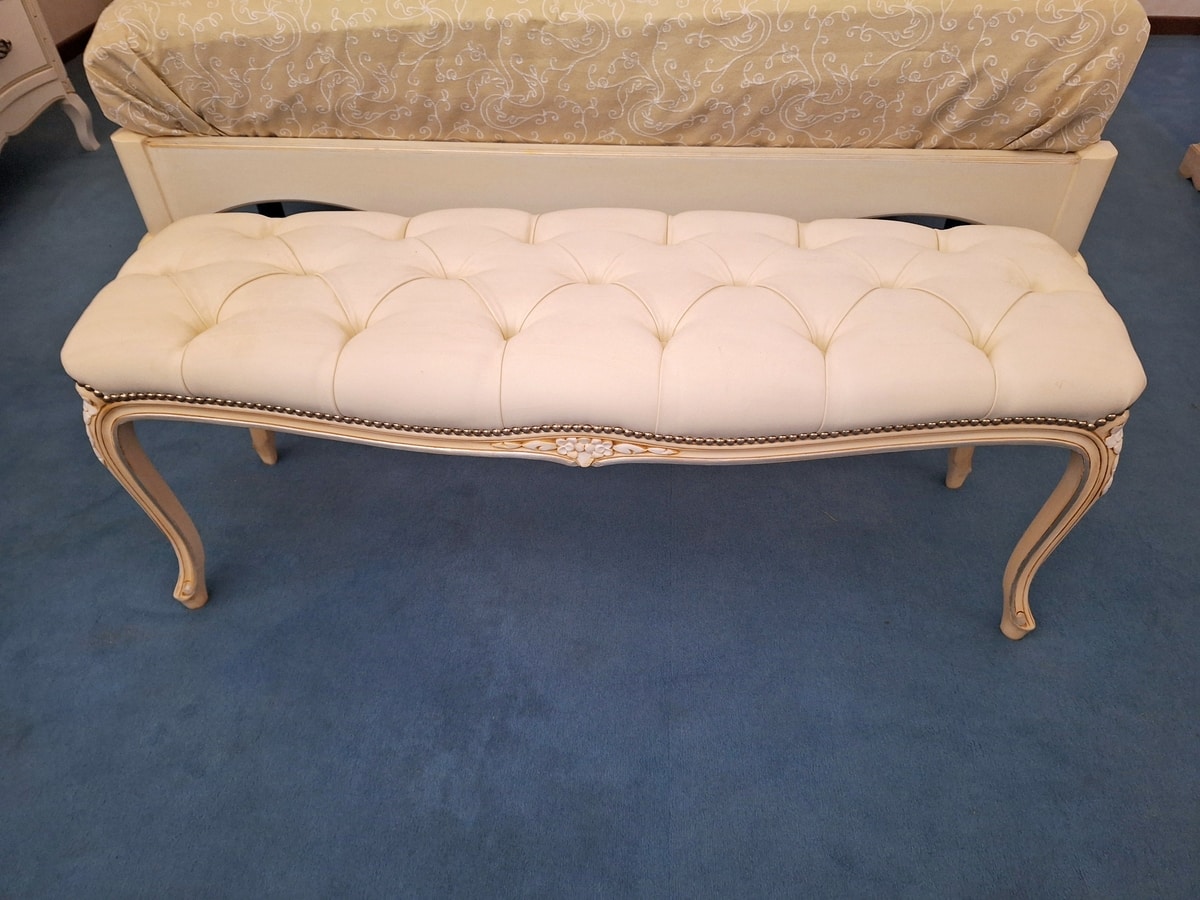 Banco de estilo clásico, con acabado lacado en blanco mate, perfiles de hoja de plata. Asiento tapizado en cuero ecológico.