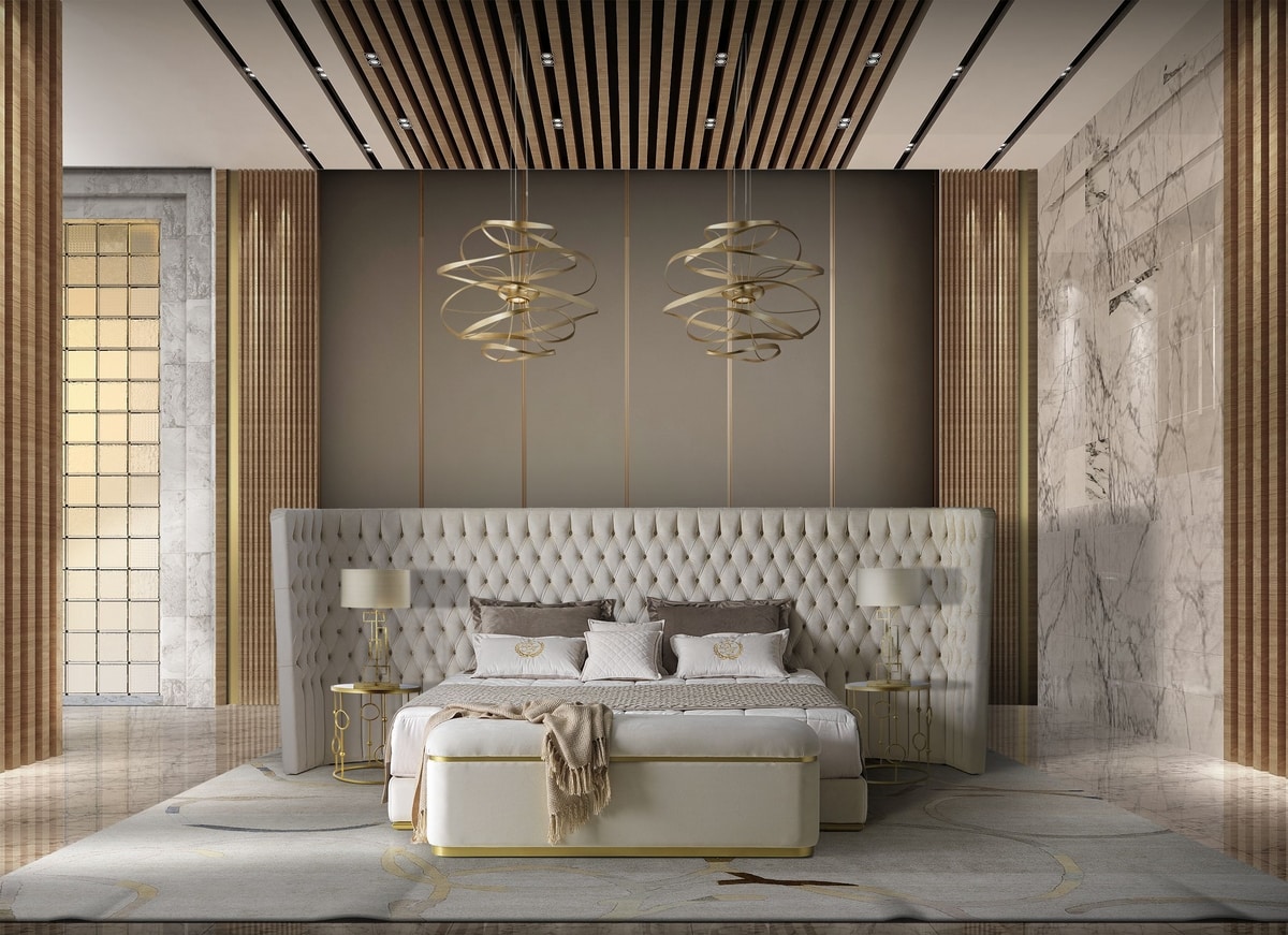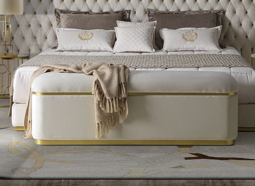 Banco tapizado adornado con perfiles de acero.