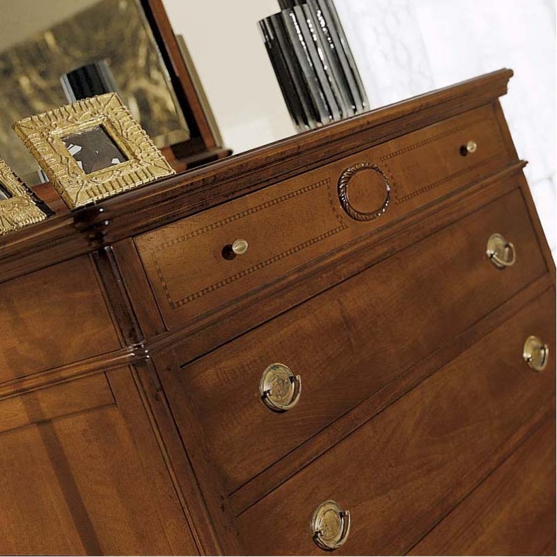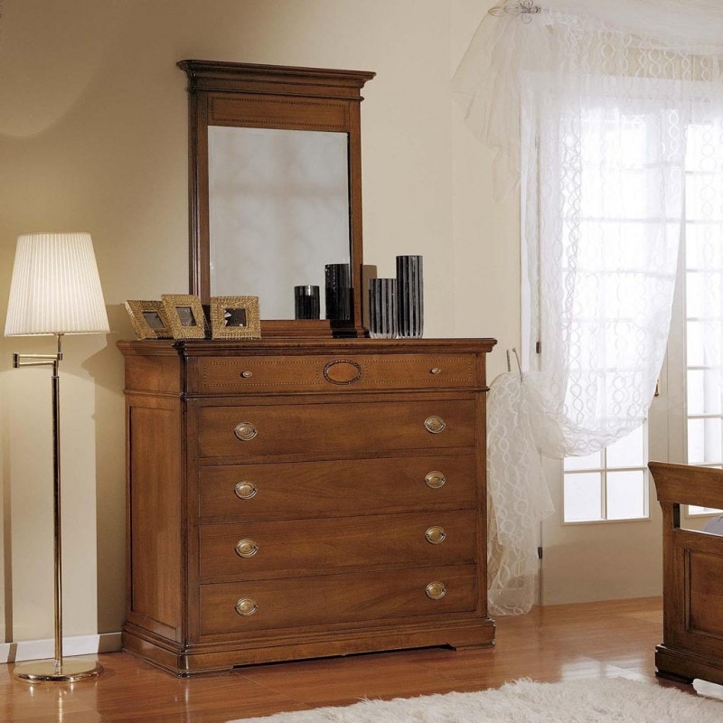 Solicitar precios Productos similaresCómoda con cinco cajones. Cajón superior con filete de marquetería y panel tallado. Estructura superior y zócalo con esquinas redondeadas, lados lisos interrumpidos por un marco colocado debajo del primer cajón. Zócalo sobre pies para aligerar la imagen de la cómoda.