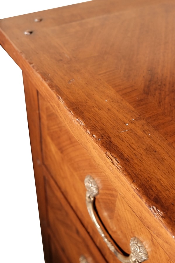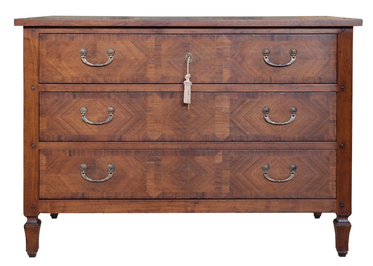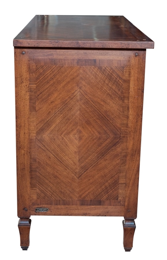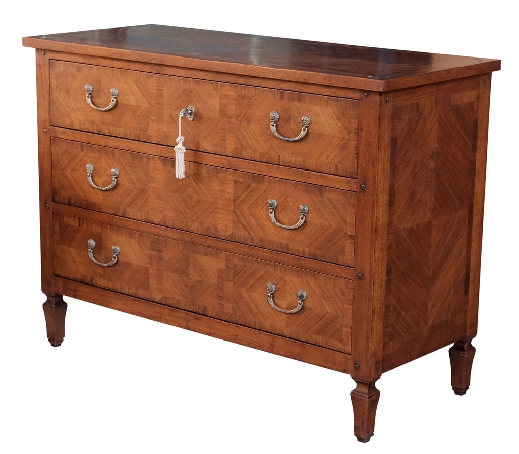 Cajonera de nogal con tres cajones, inspirada en el estilo italiano del siglo XVIII. Con incrustaciones de paneles de espiga en los frentes, los lados y la parte superior. Pies cónicos ligeramente moldeados.