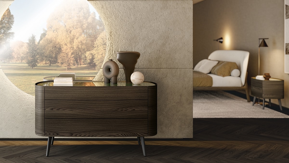Grace es una familia de cómodas y mesitas de noche de líneas a la vez armoniosas y fuertes. Se adaptan perfectamente a la gama de camas de Elli, que siempre presenta una elegancia atemporal. La estructura y los frentes de los cajones son de esencia de madera que se funde pacíficamente con el soporte metálico. La encimera está disponible en numerosos materiales: desde esencia de madera tono sobre tono hasta vidrio lacado y mármol.
