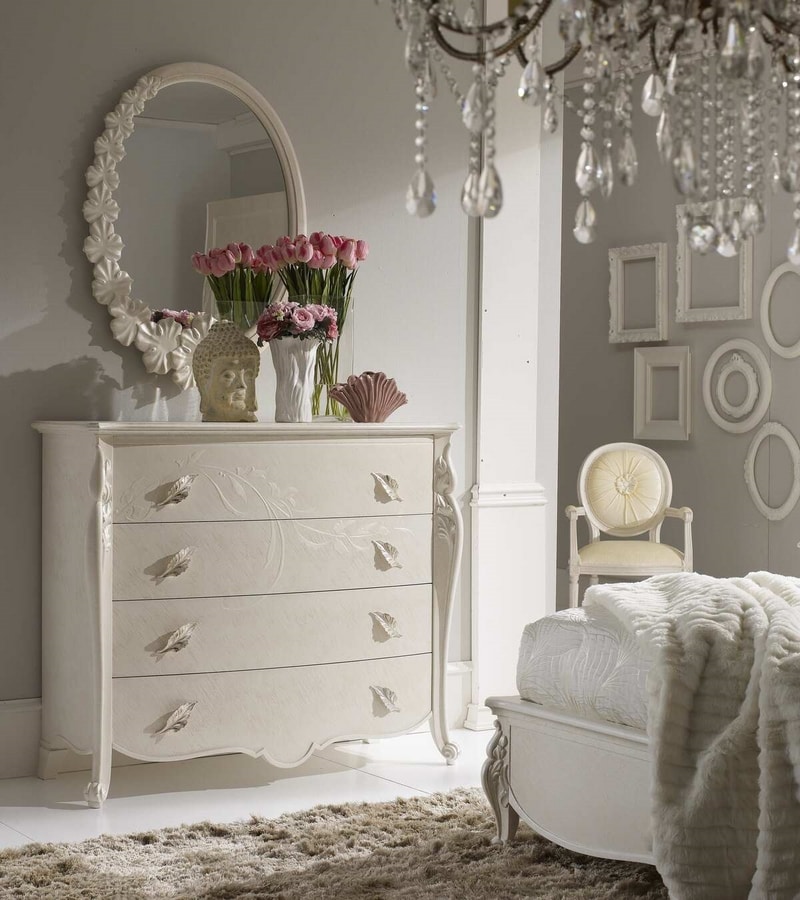 Solicitar precios Productos similaresCajonera de estilo clásico, con estructura de madera lacada, enriquecida con tallas. Manijas de plata. Equipado con 4 cajones.
