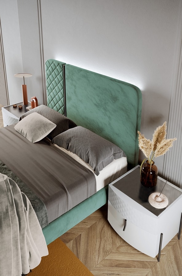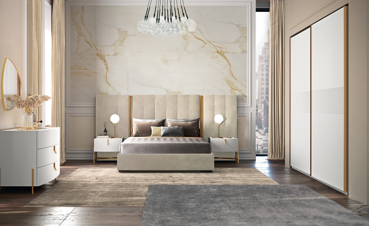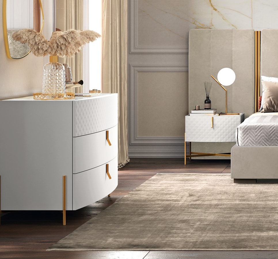 Cajonera y mesas de noche en madera lacada blanca. Top de mármol. Pies y bases en metal, acabado negro o dorado.