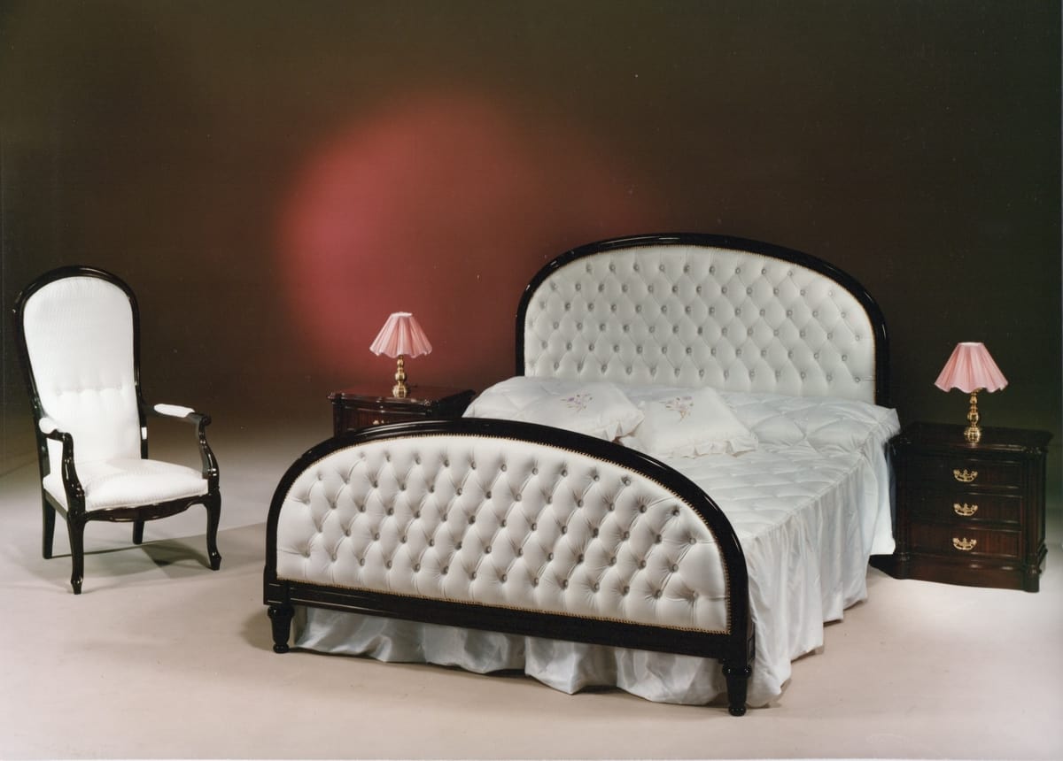 Cama de estilo inglés, en madera con acabado en caoba. Tapicería Capitonnè.