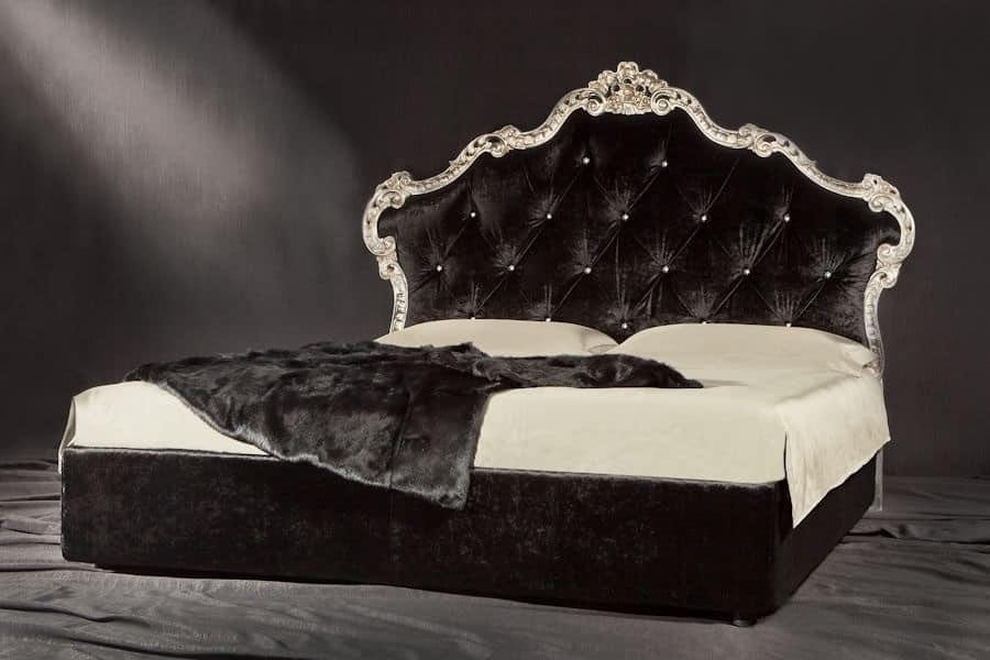 Productos similaresVALERIA Muebles de dormitorio italianos diseñados por ORSITALIA. Las camas VALERIA Queen, King y SuperKing Size, de estilo barroco francés moderno, tienen un cabecero suave acolchado, tapizado a mano, todas con mechones de botones Swarovski, por artesanos de Orsiitalia, made in Italy 100%. La cama de almacenamiento abotonada francesa Valeria by Orsitalia, la parte superior de la artesanía italiana, es un mueble rococó barroco moderno a medida y un diseño interior italiano. Orsi Italia presenta la cama con almacenaje tamaño queen y king Valeria en lujosa tela de terciopelo jaspeado y triturado negro tapizado, cabecera capitoné con marco de madera tallada con acabado plateado o dorado y cama con almacenaje elevable con cama de listones de madera. La cama con almacenaje Valeria de Orsitalia-Milano, otomana con elevación de gas en estilo barroco francés italiano negro, se puede personalizar en acabado de madera y en terciopelo o imitación de cuero o cuero flor, gracias a la habilidad de Orsitalia en la producción de juegos de dormitorio modernos y cassic adquiridos desde el año. 1955. VALERIA by ORSITALIA, camas STORAGE de estilo barroco francés clásico a medida, decoración italiana barroca negra, encajarán en cualquier dormitorio donde se coloquen: en decoración del hogar o en proyectos de lujo de hostelería. La cama doble Valeria siempre llamará la atención por su belleza y fina talla y caracterizará con fuerza su dormitorio. Los proyectos de Orsitalia for Contract Hospitality Indoor también pueden suministrar la cabecera de cama barroca con mechones o de terciopelo negro liso únicamente, cabeceras de cama italianas clásicas para colgar en la pared para suites de lujo. Orsitalia ofrece siempre soluciones de decoración a medida, incluso para uso hotelero, gracias a una amplia gama de tejidos para confección a medida: pieles italianas sintéticas ignífugas, terciopelos Trevira, damasco clásico ignífugo o satén ignífugo. Además, Orsitalia completará el diseño interior de su dormitorio con ropa de cama especial, almohadas decorativas, cortinas, mesitas de noche y cajones. Nuestro lema es: podemos hacerlo y podemos hacerlo mejor.