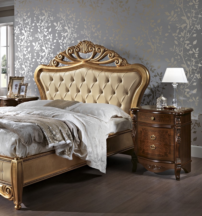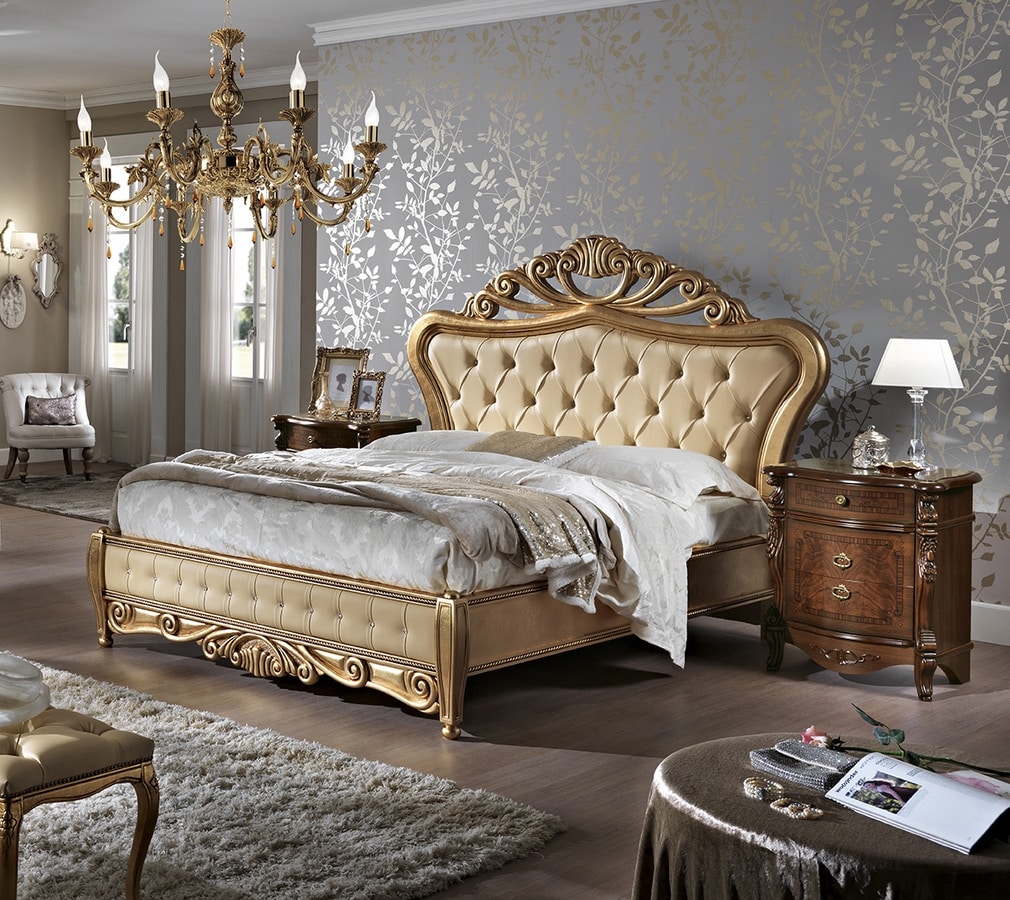 La cama, revestida con pan de oro, encaja perfectamente con la habitación, completándola y enriqueciéndola.