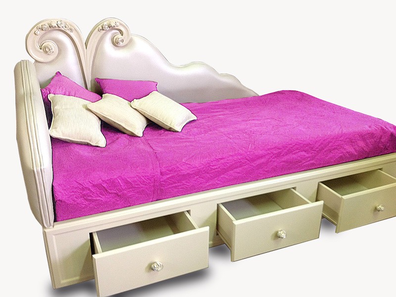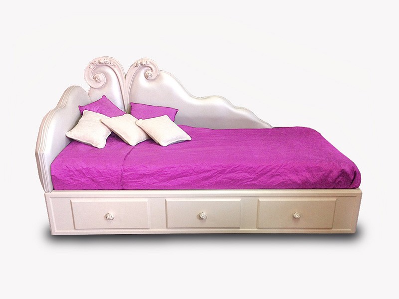 Cama con cajones. Cama individual en madera con acabado blanco perla, tapicería de cuero sintético.