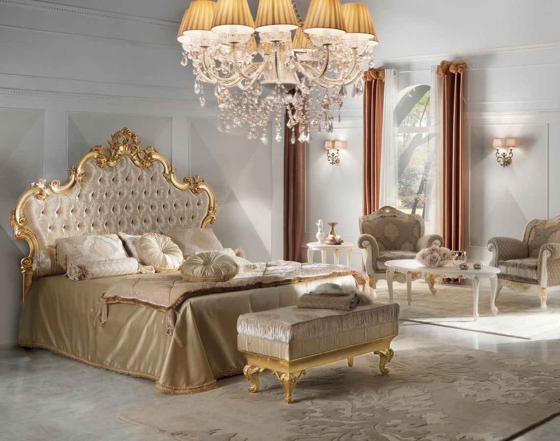 Cama Diamond 180x200 en madera tallada, íntegramente en pan de oro, cabecero en terciopelo acolchado.