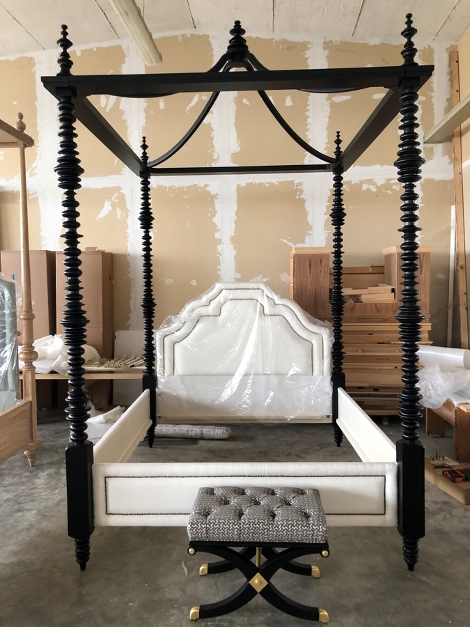 Cama con dosel de madera de haya con banco de estilo clásico, hecho Custon. Cabecera acolchada.