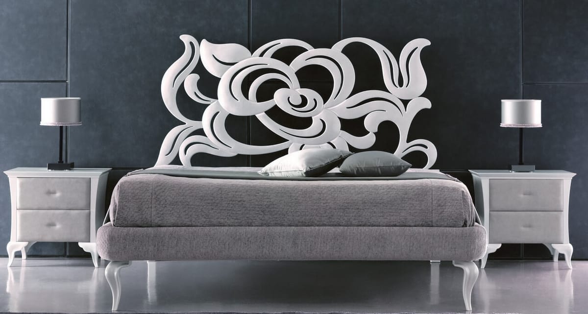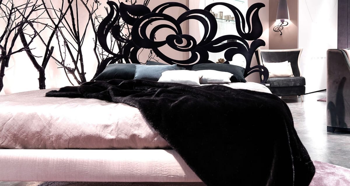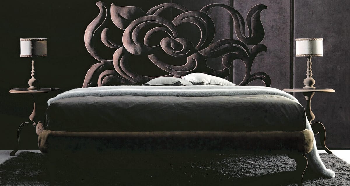 Una cama de hierro decorativa, con cabecera de hierro forjado cortada con láser, con efecto tridimensional; el barandal de hierro está acolchado y cubierto de cuero, ecopiel y tela. El robusto grosor de las curvas de hierro, característica principal de Megan, recuerda a los sensuales pétalos de rosas: un gran efecto, para una cama inolvidable. Estructura de hierro cortado a mano y pulida a mano. Barandilla de hierro adecuada para tapicería y patas macizas de haya.