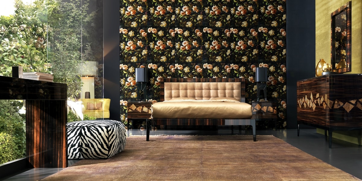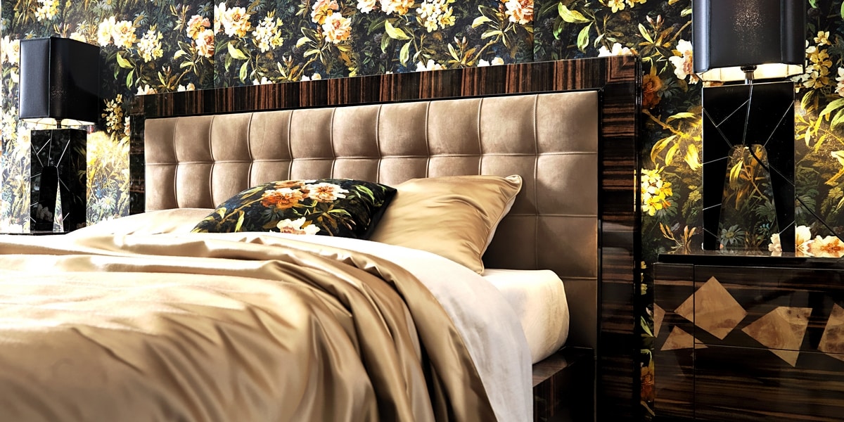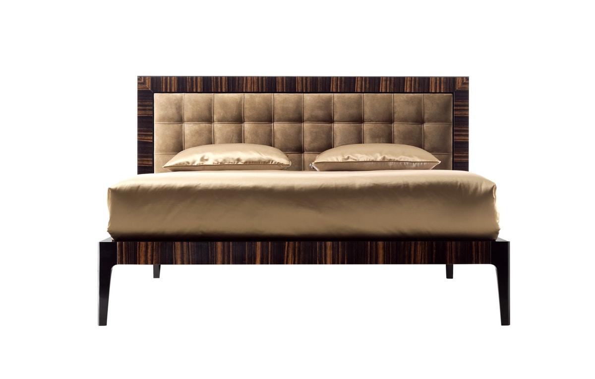 Le cadre de la tête de lit est en multi-plis avec placage d'ébène, l'encadrement du lit est en tulipier massif laqué, le revêtement, non amovible.