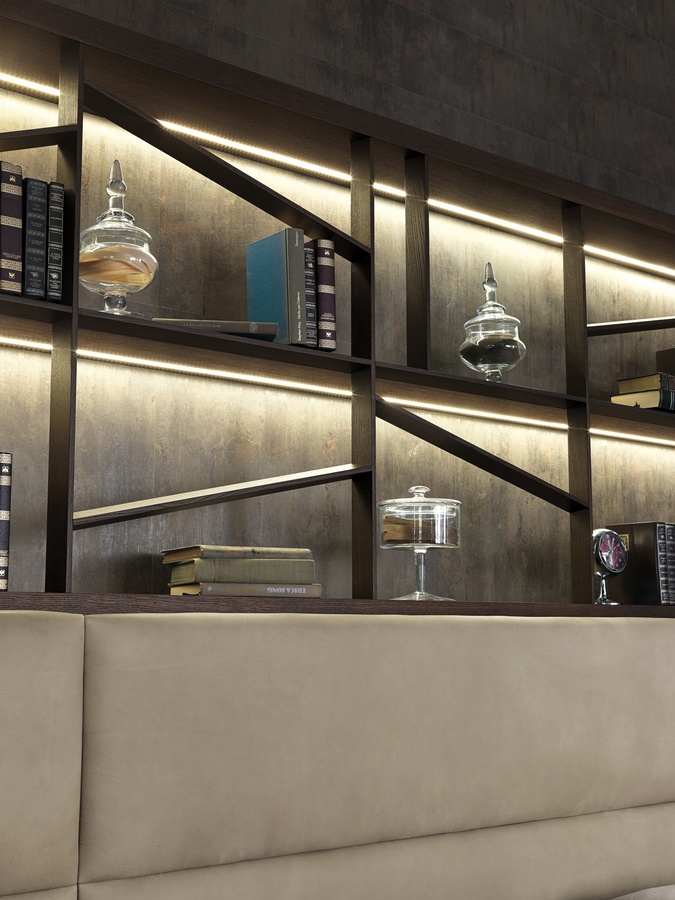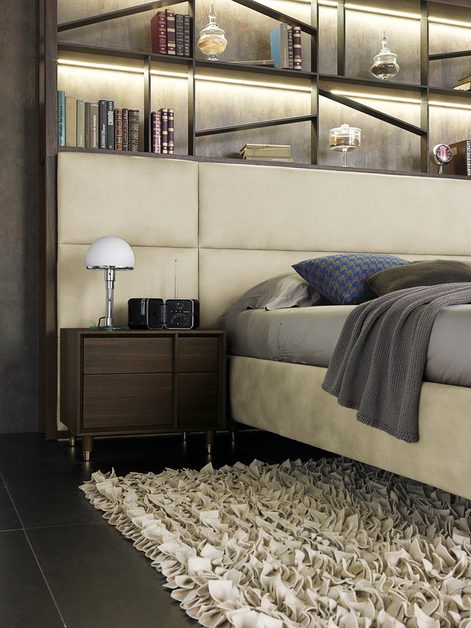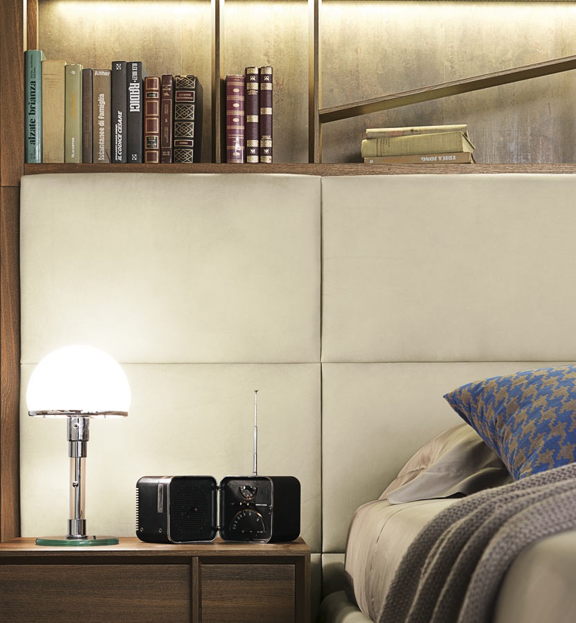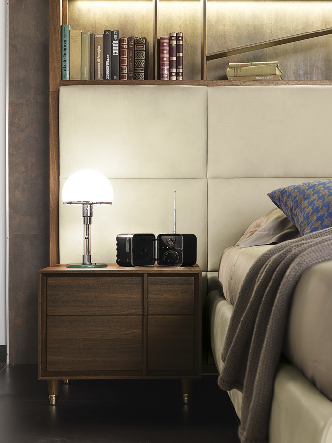 Esmero en los detalles y los acabados con tirador sacado de la madera maciza en altorrelieve en el frontal del cajón. Puntal con forma de vaso para las patas dotadas de antideslizante para proteger el suelo. La cama Bookcase nace, está creada y realizada como cama escultura en madera maciza, trabajada en líneas verticales y en diagonal con dos grandes estantes para apoyar equipados con luz Led, con mando independiente táctil. Puede ser realizado en los acabados como en muestrario con cabezal en: tejido, piel y polipiel.