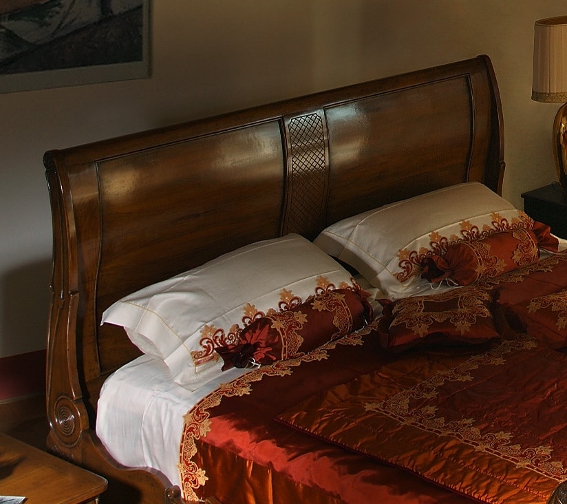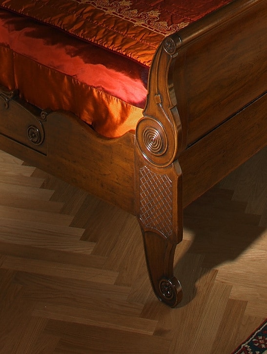 Gran cama tipo trineo de nogal, inspirada en el estilo Luis Felipe. Cabecero y lados tallados con delicados remolinos florales y patrones geométricos.