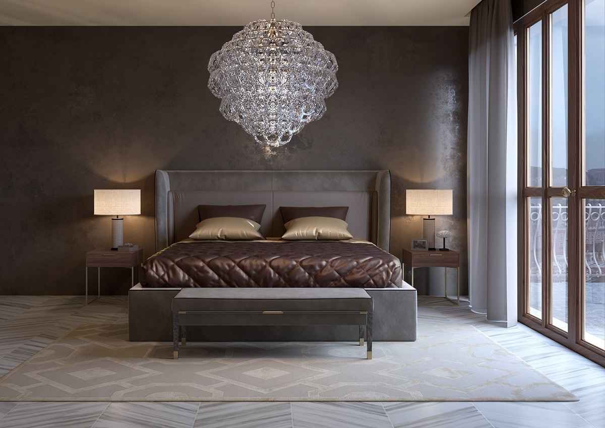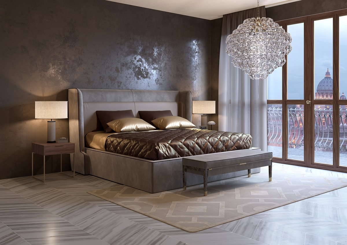 Importante cama tapizada en tabaco de color ecoleather vintage, con cabecero y cojines dobles en el interior (en la foto: cojín en tabaco de color seda).