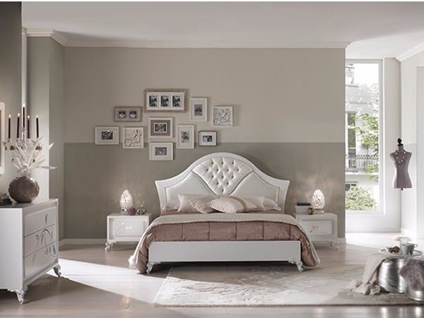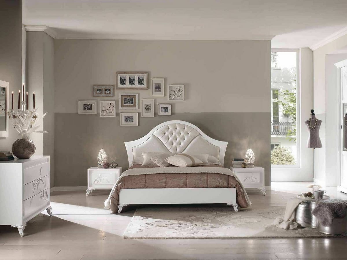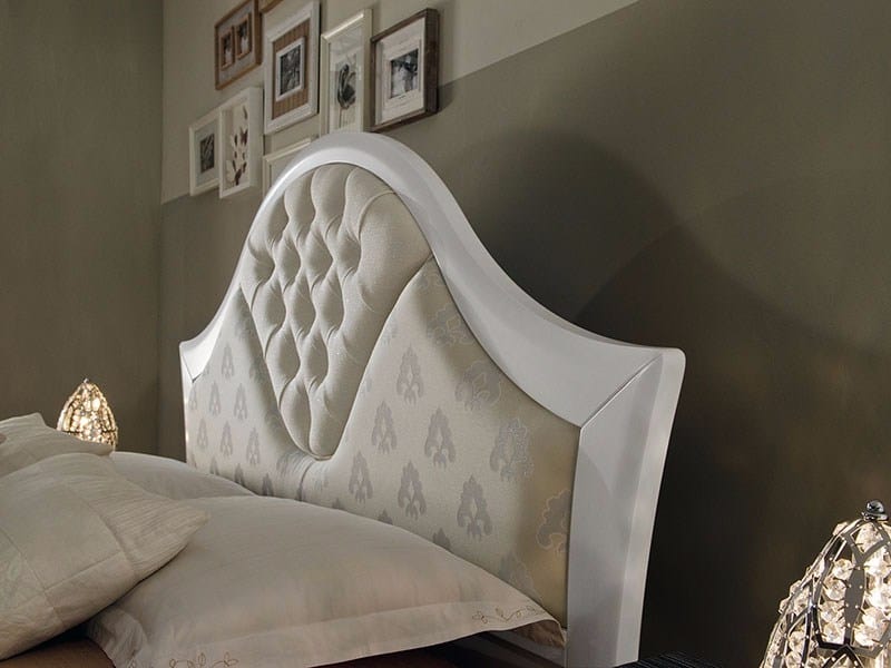 Elegante cama con cabecera tapizada, con mano de obra copetudo. Estructura de madera Ideal para amueblar habitaciones con un estilo contemporáneo clásico.