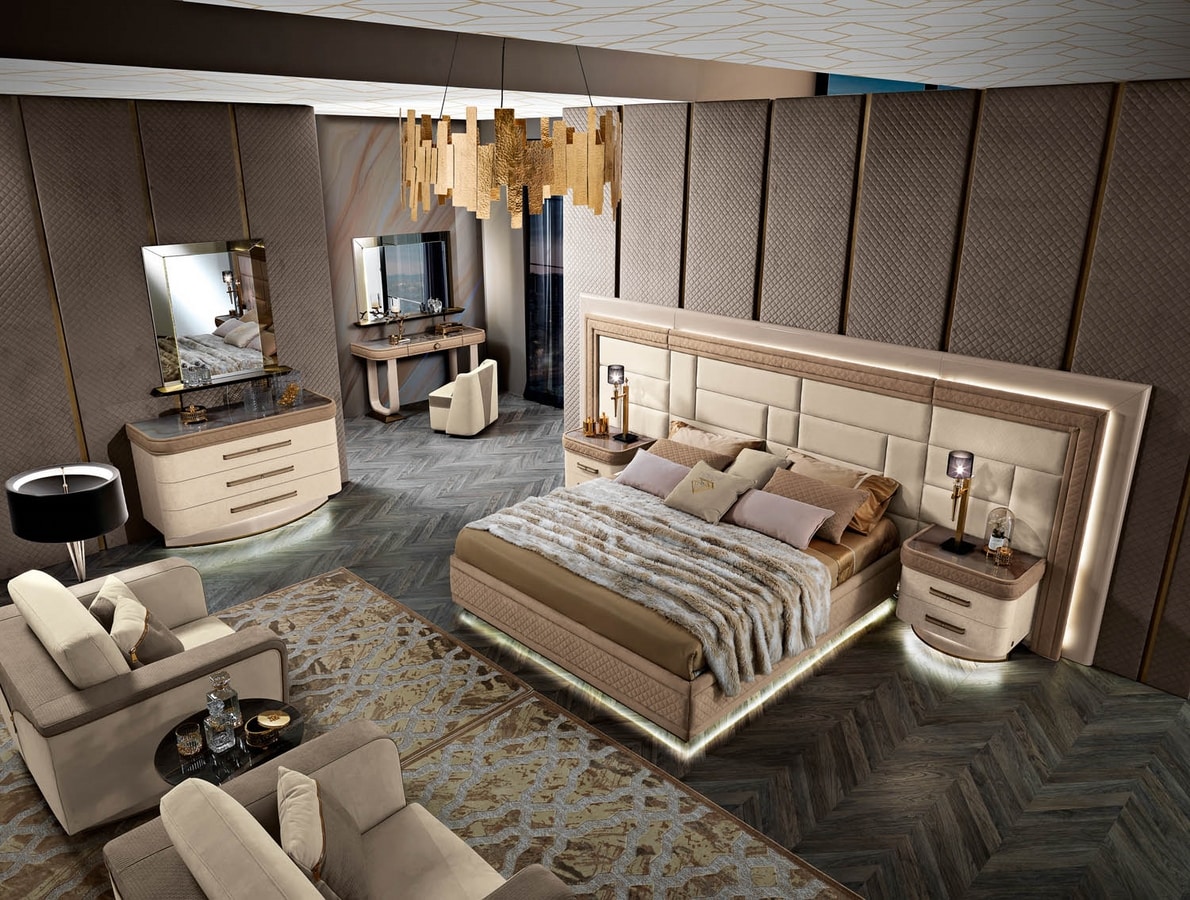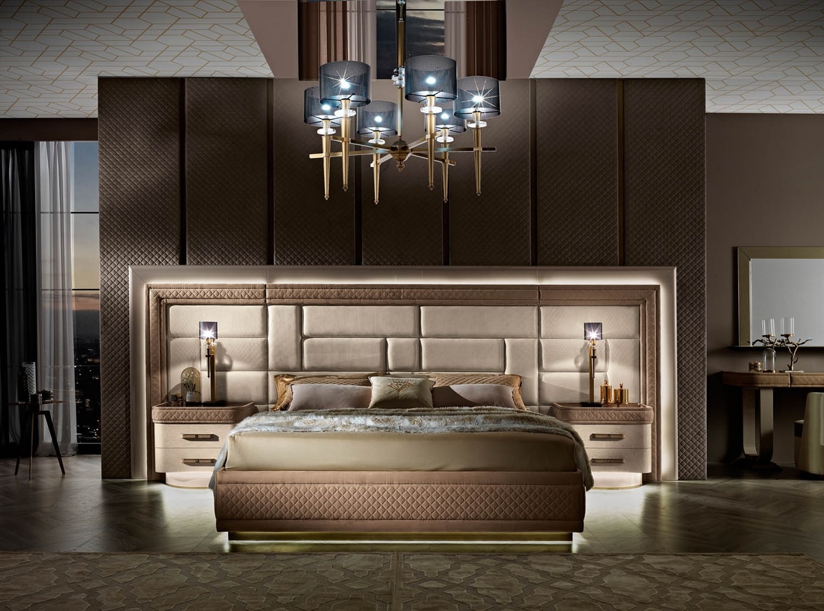 La cama Diamond da la identidad del entorno. La forma rigurosa del marco de la cama crea el contraste formal y visual adecuado con el ancho del cabecero de madera lacada y tapizado en terciopelo. La presencia de luces led en los perímetros son elementos diferenciadores y exclusivos. Bajo pedido también en cuero y nabuk.