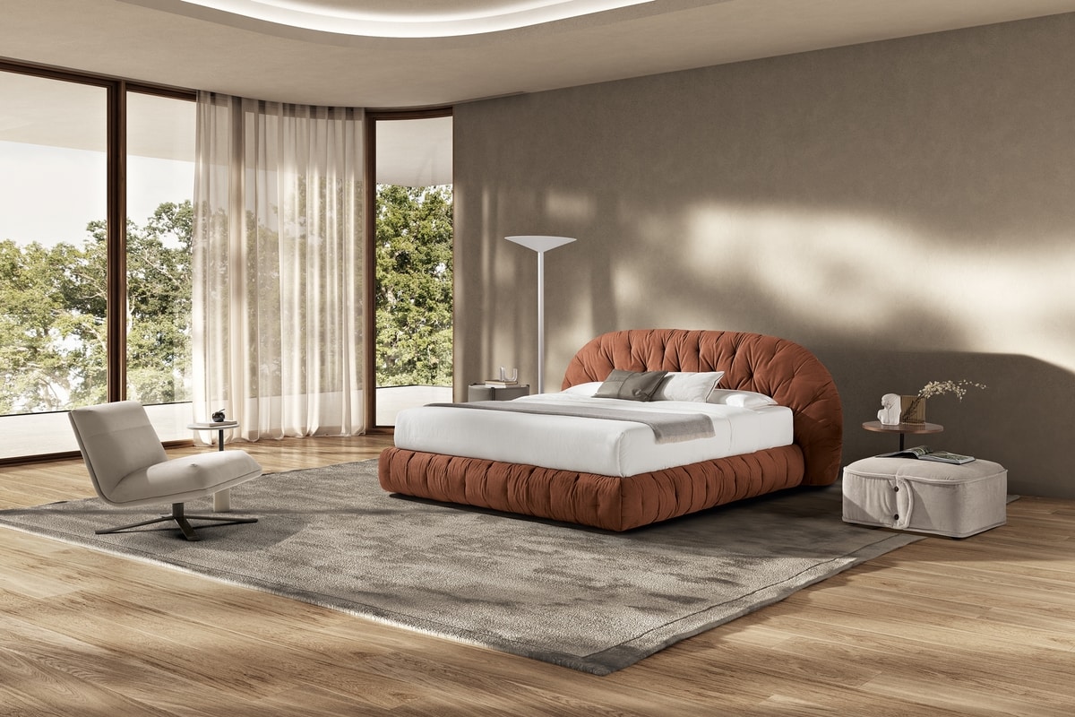 El elemento principal de una zona de noche se inspira en líneas fluidas y acariciantes, la cama Globo ya destaca a primera vista por la suavidad que caracteriza el cabecero, caracterizado por finas costuras a medida, y el sommier. El sommier en sí está acolchado y tapizado con la misma tela que la cabecera, lo que le da a la cama un ambiente general refinado pero no demasiado formal.