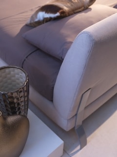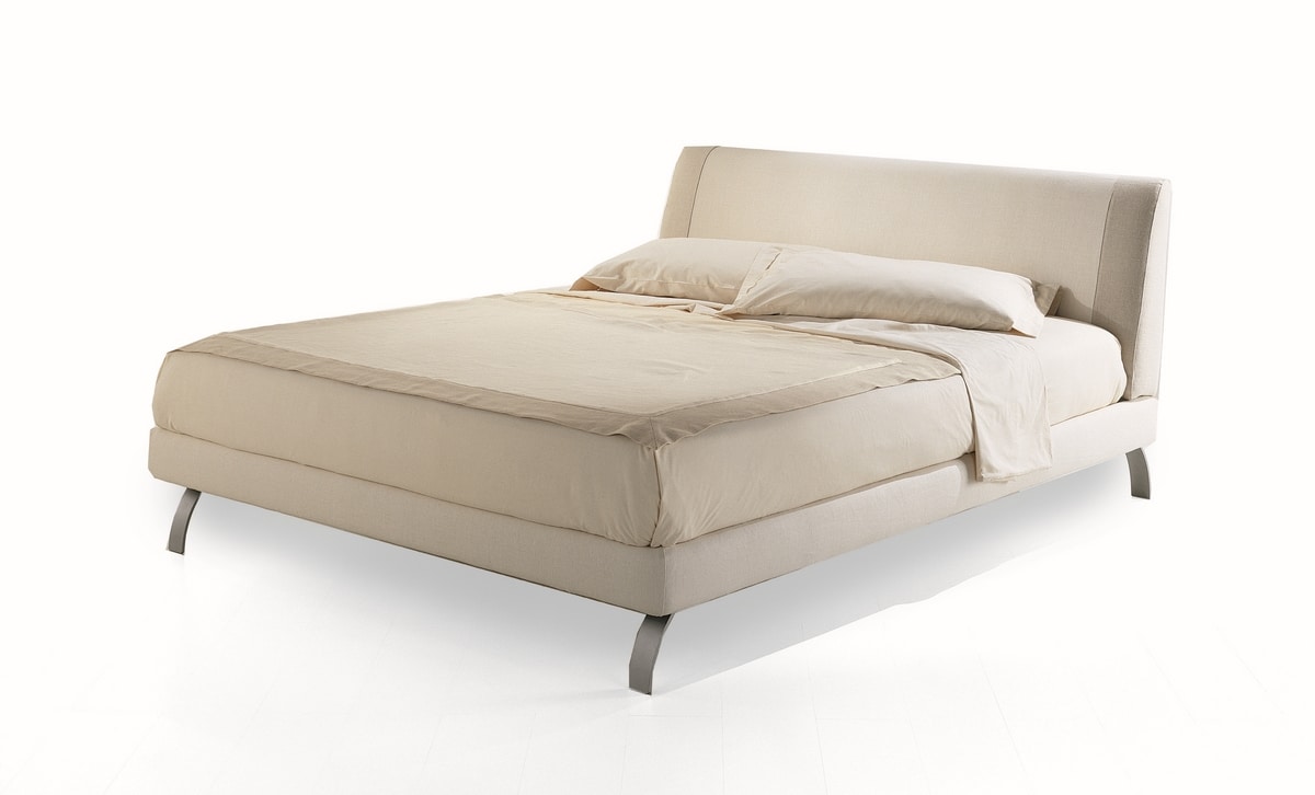 Cama con estructura de madera tapizada con espuma de poliuretano y Dacron. Ortopédica colchón de apoyo con listones de madera de haya. Cabecera con una tela o con la combinación de dos telas diferentes. Tejido totalmente desenfundable. Doblada cuota de metal, color aluminio teñido.