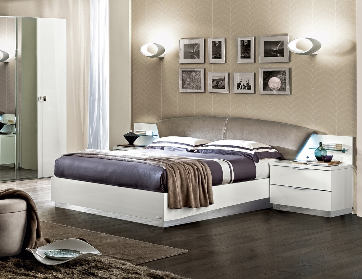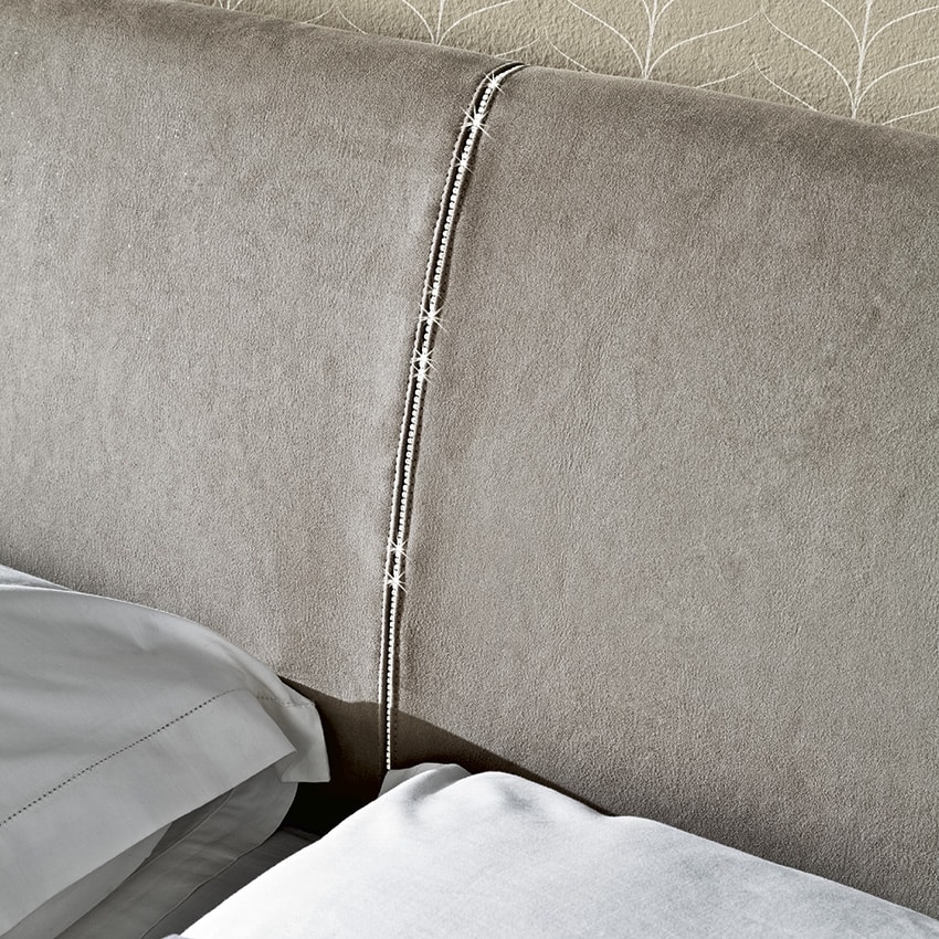 Colección ONDA: carácter y diseño. Características modernas con detalles Art Deco. Cabecero abatible tapizado con luces de cortesía laterales y asas en forma de onda. Barandillas laterales perfiladas y zócalo cromado en el anillo de la cama; funcional con nuevo sistema de marco abatible. Los espejos biselados del armario y el tirador Swarovski completan la estética nueva y original de un producto “Made in Italy”.