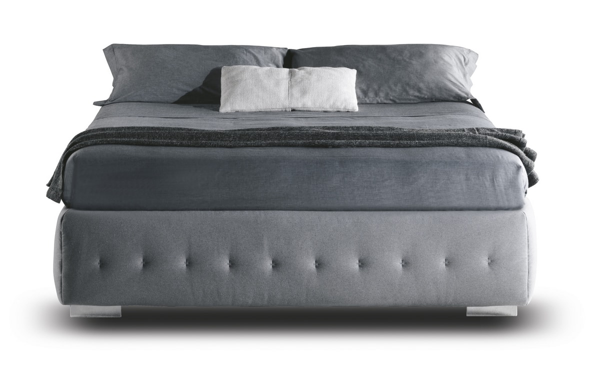 El somier Raja se distingue por su apariencia estética de la base acolchada. Es disponible en versión fija con láminas, con contenedor y contenedor "Komodo", un práctico sistema que plantea el somier y el colchón para hacer la cama sin dificultad. Raja es desmontable para un fácil transporte. La funda, disponible en varios colores, es totalmente desenfundable y lavable según la tela elegida.
