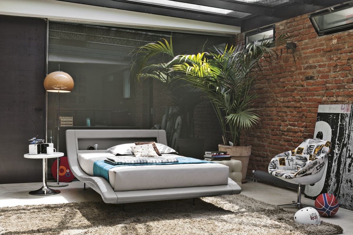 Cama plaza y media tapizada en suave soft-touch y cabecero con cómodo compartimiento portaobjetos.