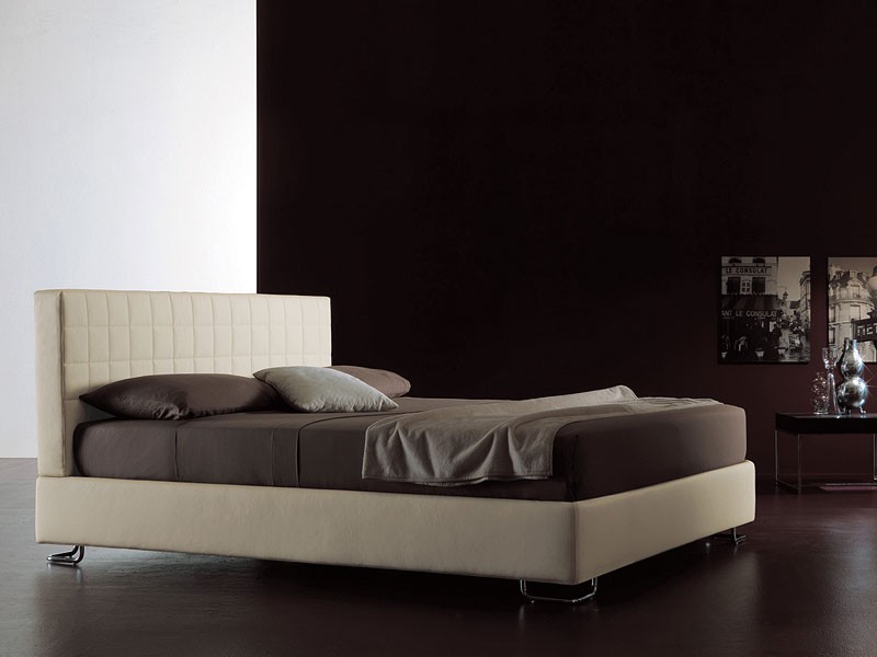 Rellenos cama con estructura de madera tapizada con espuma de poliuretano y Dacron. Cabecera de la versión de árboles: suave o acolchado horizontal y acolchado cuadrados. Ortopédica colchón de apoyo con listones de madera de haya. Cubrir la cama de la base de acabado en base rígida con los pies para ver. De almacenamiento de base a petición. Tejido totalmente desenfundable. Pies en madera de haya teñida de nogal / cerezo / wengé con base de metal satinado o brillante en acero cromado tubular.