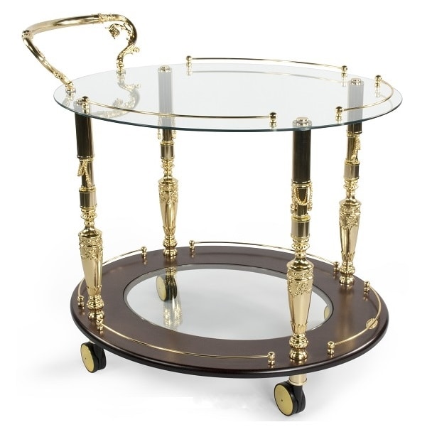 Carrito de comida de estilo clásico de lujo. Estante superior en vidrio templado con 6 mm de espesor. Base de madera y vidrio Ruedas con capacidad para un total de 150 kg. Estructura en latón, 24 Kt dorado o plateado.