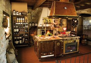 Madera de la cocina amueblada,, campana de cobre pasada de moda
