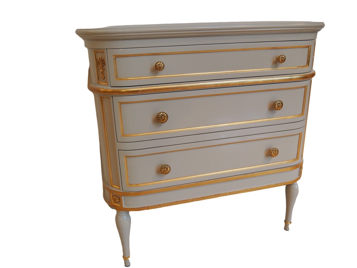 Pequeña cajonera en madera perfilada con cajoneras, estilo francés, laca brillo, aplicación de cenefas talladas a mano con acabados pan de oro o símil pan de oro. Tapa en mármol o en madera decorada con imitación mármol.