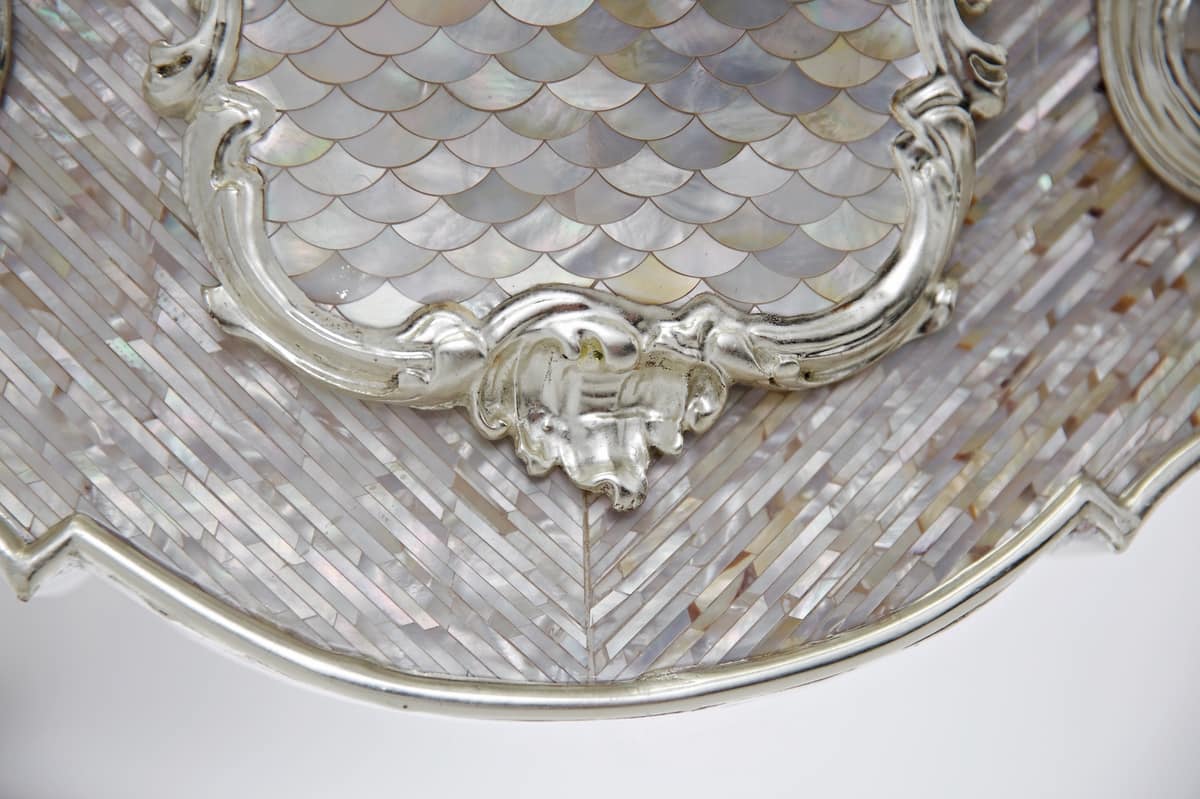 Las incrustaciones florales emergen sinuosas, y sus volúmenes elaborados se disuelven en la superficie lisa de las virutas de la madre-perla, y todo viene graciosamente junto.