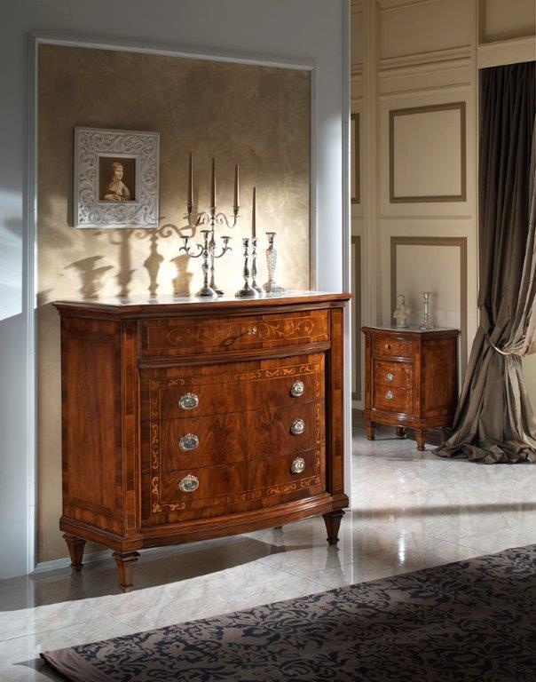 La cómoda y mesitas de noche de la colección Maser están adornados con tallas e incrustaciones.