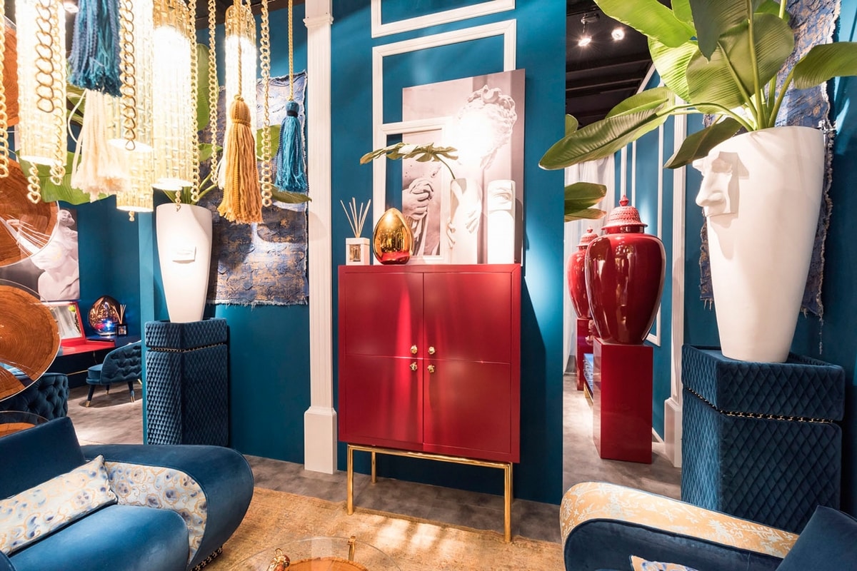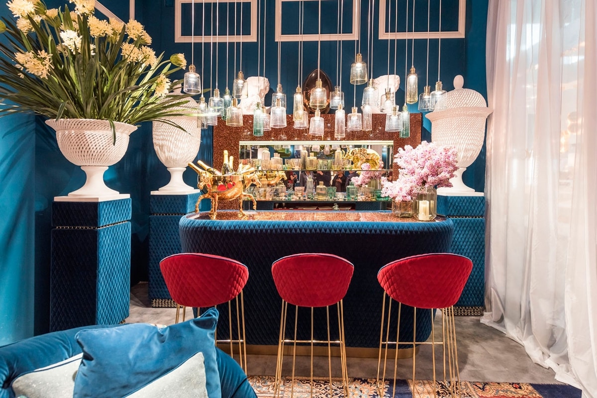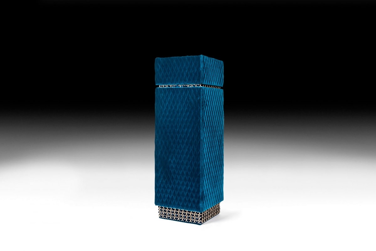 Pedestal de escultura moderna con tapizado de terciopelo azul acolchado y cadena de metal dorado en la base, tejido con terciopelo, una clara referencia al mundo de la moda.