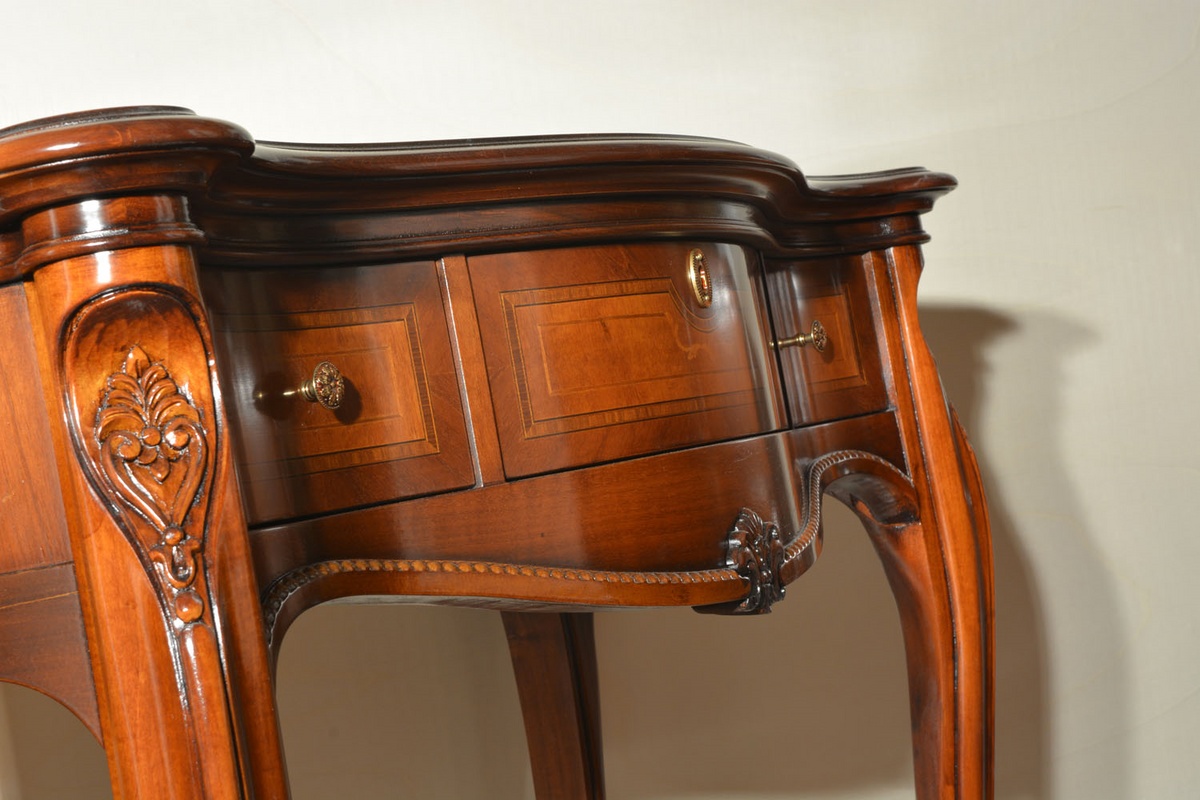 Consola de madera con 3 o 5 cajones para el salón y sala de estar. consolle lujo para las entradas y salas de estar. Tallas e incrustaciones hechas a mano de madera sólida. final de la cera. También disponible con la tapa de mármol y detalles en oro o plata de la hoja. Todo el trabajo es estrictamente artesanal y producido en Italia.