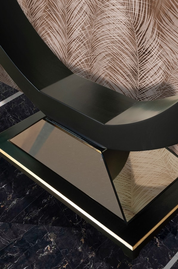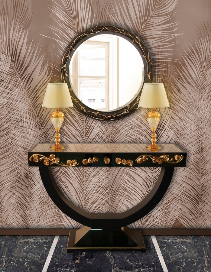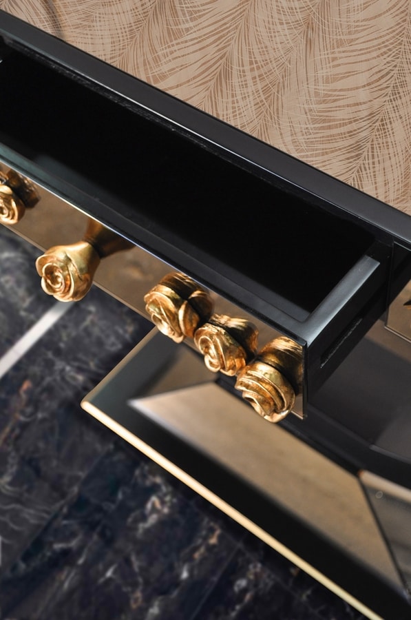 Elegante consola de madera con espejo de bronce, decoración artesanal en relieve en forma de flor en pan de oro, acabado lacado negro, con cajones.