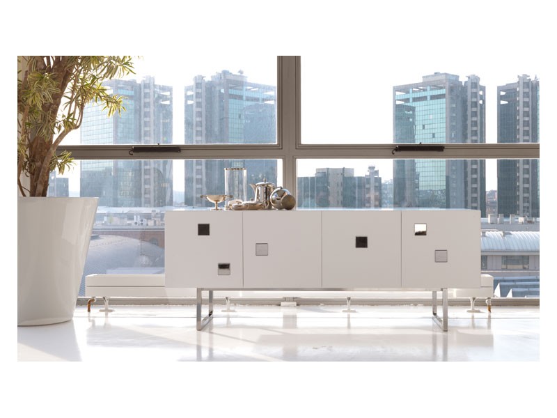 Aparador en roble o nogal con puertas a batientes y manijas cromadas. Basamento en acero cromado o lacado blanco. Se envia montado, el basamento se puede atornillar para el envio final.
