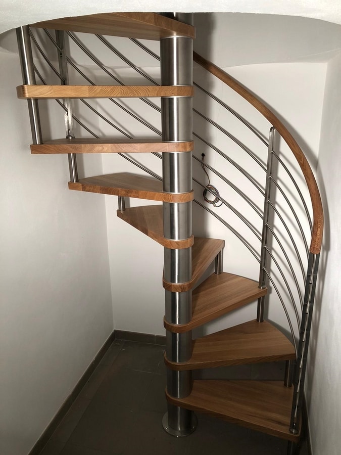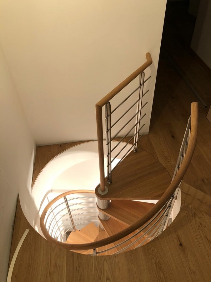 Escalera de caracol, con parapeto en acero cepillado, peldaños en roble cepillado.
