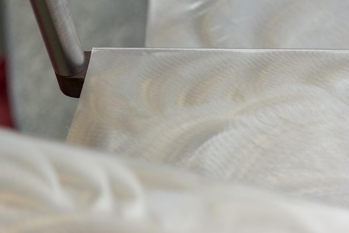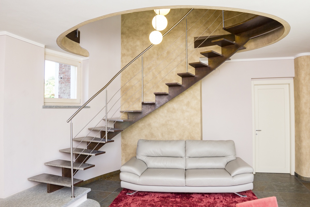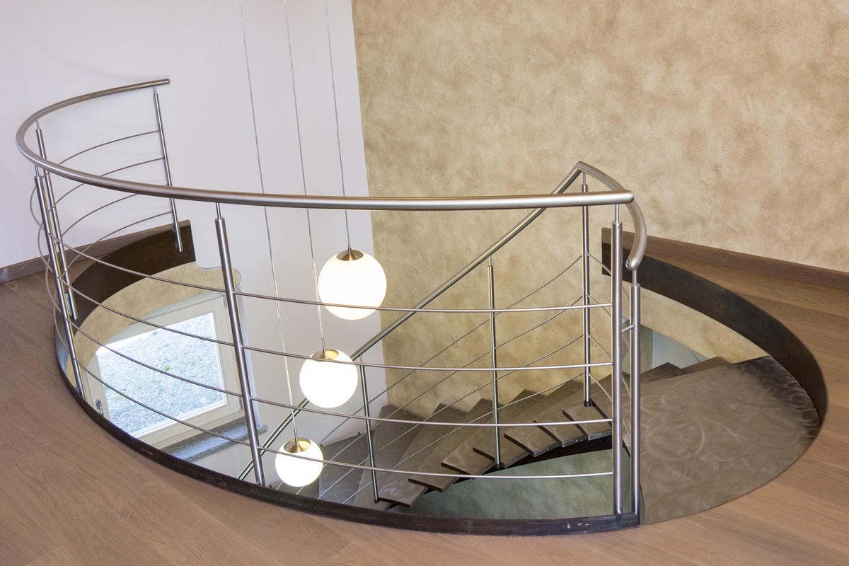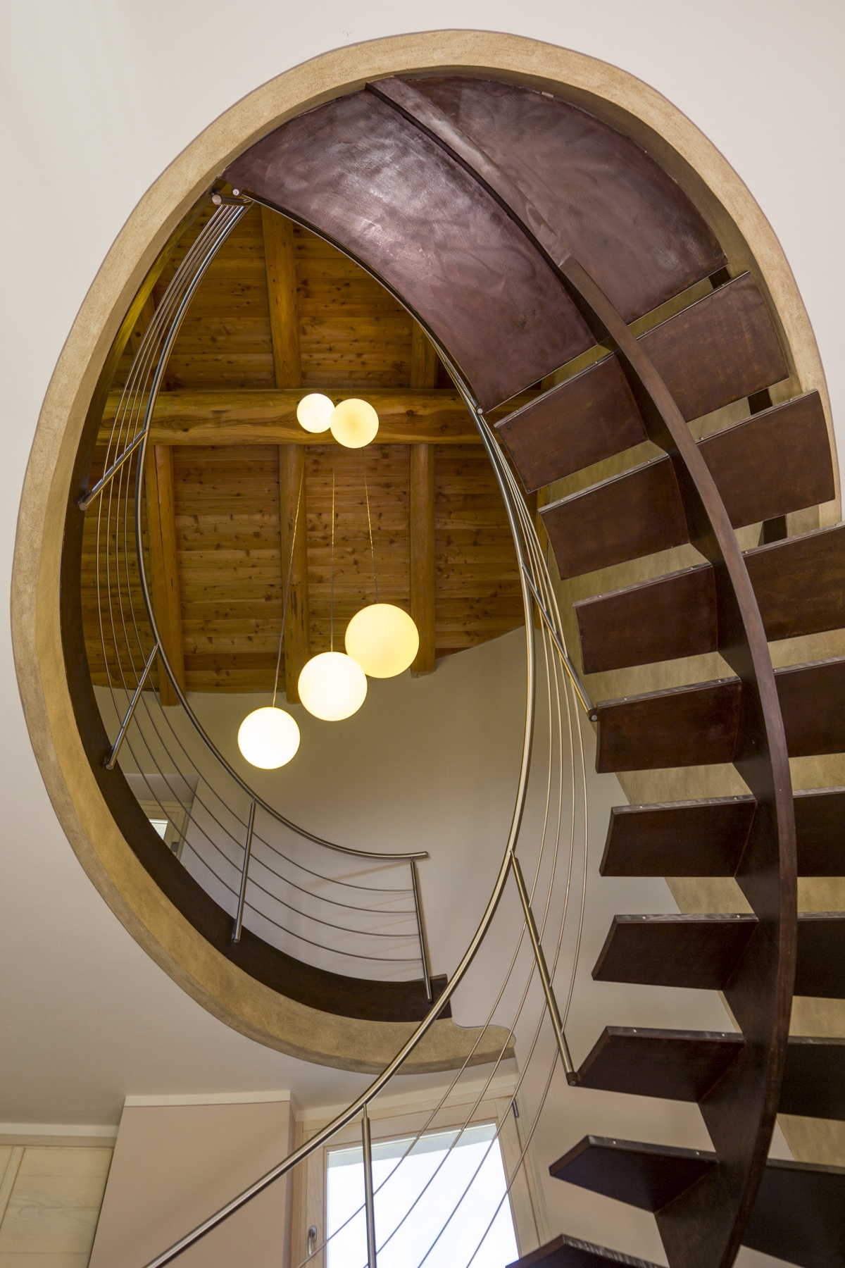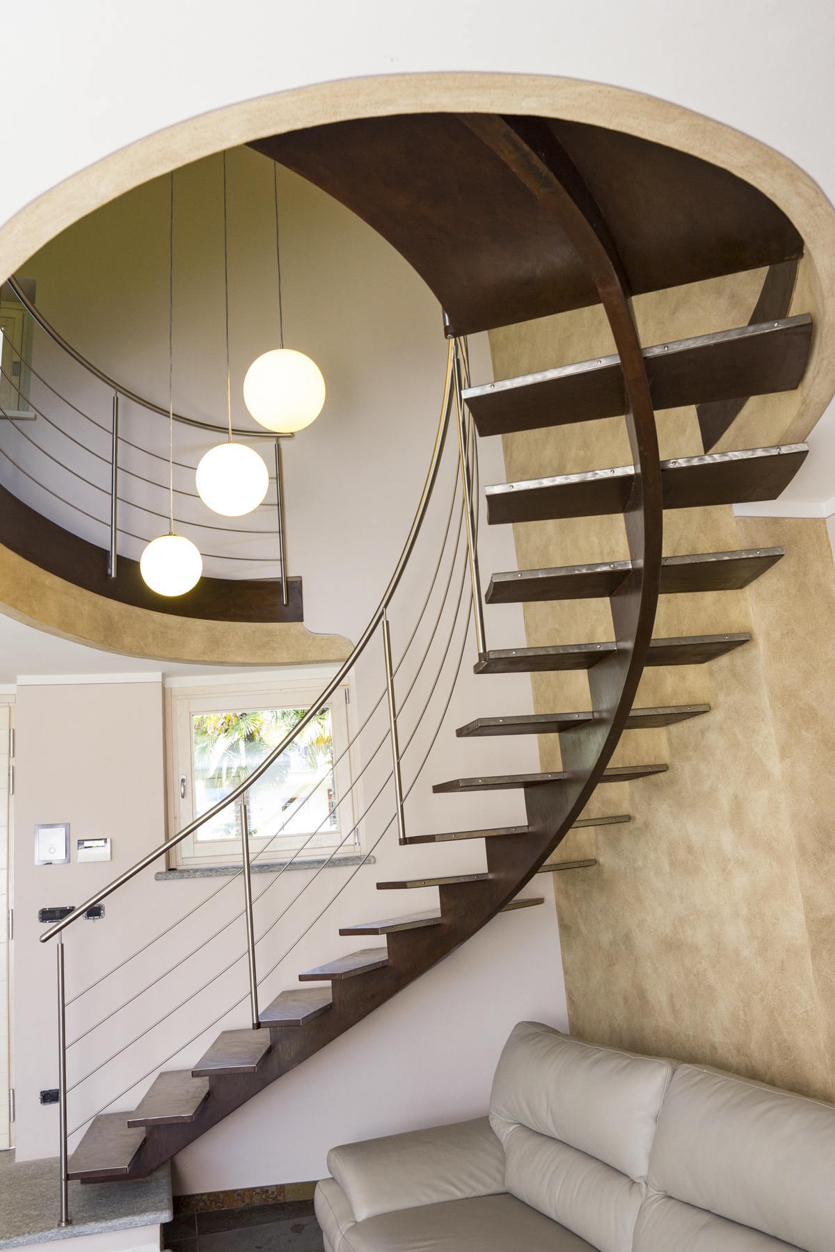 Escalera con estructura central de pie en acero corten, se inicia la estera de acero corten acero inoxidable cepillado barandilla todo en las corrientes horizontales de acero inoxidable cepillado.