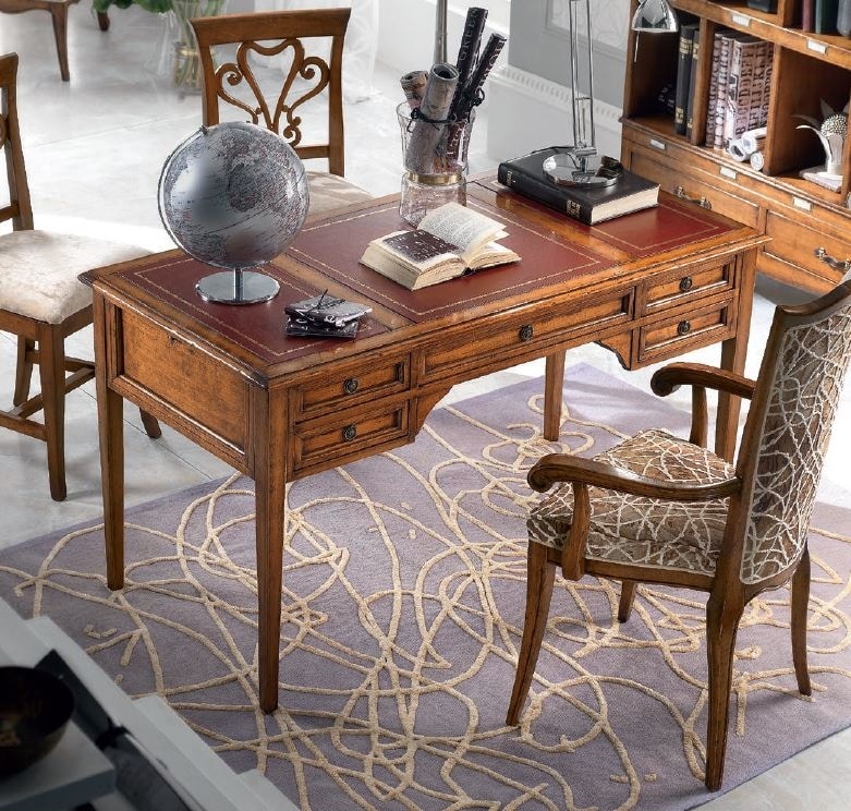 Escritorio directorio, estilo clásico. Fabricado en madera y equipado con 5 cajones. Top con inserciones de cuero.