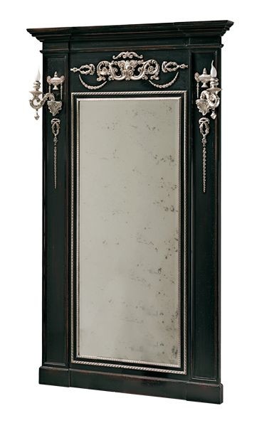 Espejo lacquared con decoraciones con incrustaciones y columnas laterales.