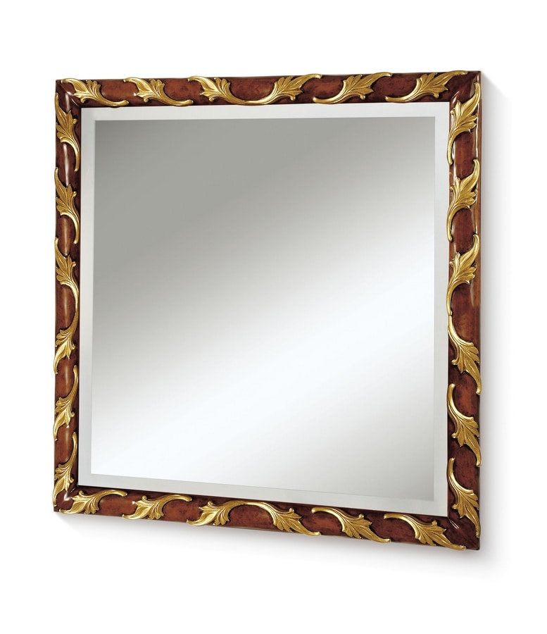 Espejo cuadrado, estilo clásico, con marco de madera, con tallas decorativas, acabado de hoja dorada.