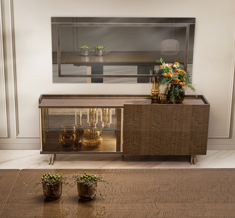 Las geometrías sobrias y limpias se ven realzadas por los acabados de nogal sicomoro de alto brillo que caracterizan las superficies, haciéndolas luminosas y profundas, y creando sofisticados juegos de reflejos.